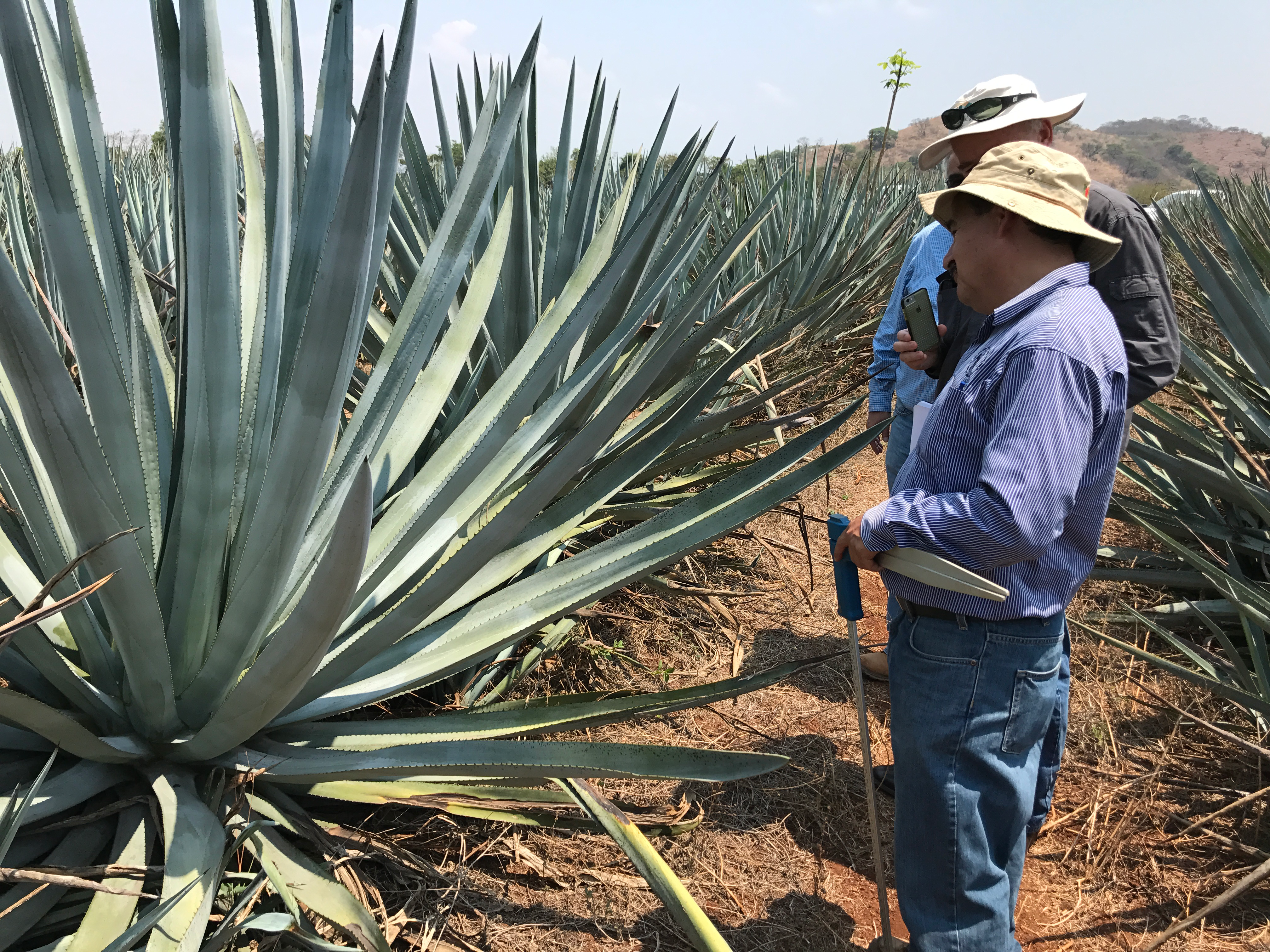 An Agave grower in Tequila, Mexico examines his crop which is ready to harvest. Each plant weighs more than 100kg. Photographer: MSF Sugar General Manager Business Development, Hywel Cook.
